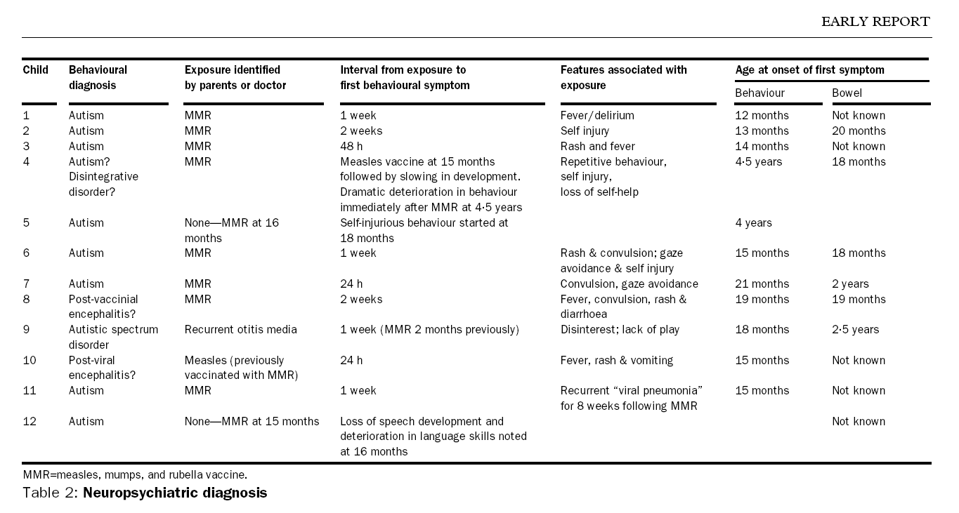 I risultati del lavoro sono riportati nella tabella seguente, tratta dal lavoro originale, leggerla oggi, anche sapendo che é frutto di una falsificazione, vengono i brividi. La tabella elenca i bambini osservati (Child), la diagnosi comportamentale ed il fattore identificato come scatenante la patologia (MMR nel testo cioè MPR in italiano la vaccinazione morbillo-parotite-rosolia).