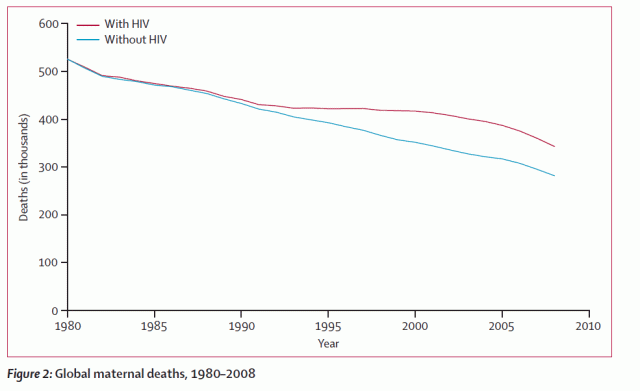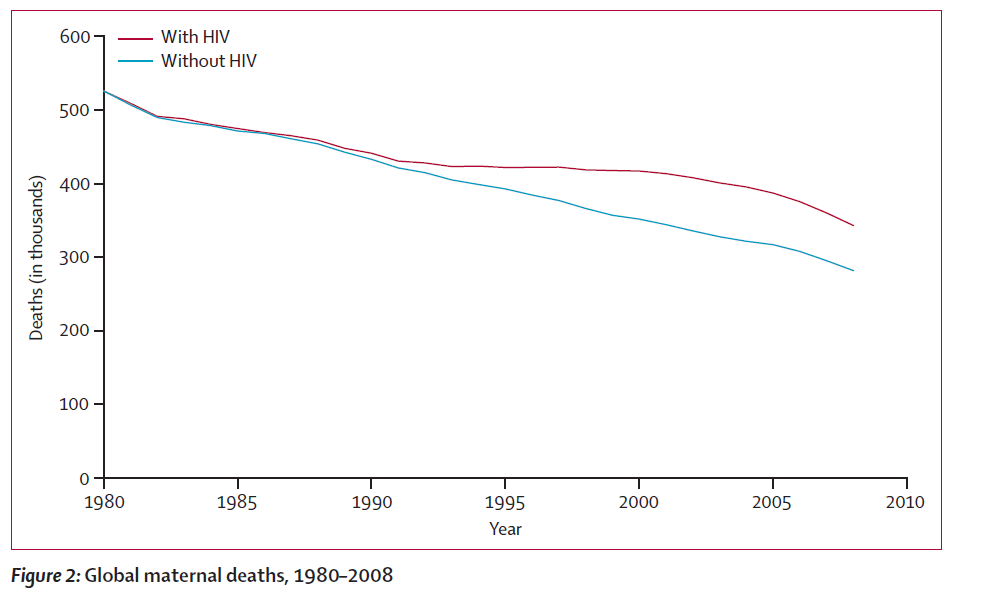 Il grafico rappresenta il declino della mortalità materna in presenza ed in assenza dell’AIDS. L’epidemia di AIDS (iniziata nel 1990) ha determinato un rallentamento nella diminuzione della mortalità materna (linea rossa).