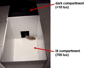 Dark Light test: il topino é posto in una scatola separata in due aree, una illuminata ed una scura. Il topo meno ansioso passera più tempo nella parte illuminata (qui).